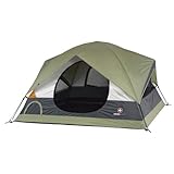 It offers a two-pole fiberglass frame for good stability, three triangular bay windows with inside zippered storm flaps (2 sides and 1 rear), and Flex style door. The roof vent provides for better air flow and cooling in hot weather, and it comes with a rain fly to protect you when the weather turns nasty. You get a number of storage options to keep your gear out of the way, including a gear loft organizer, e-port for electrical cord access, mesh organizer pockets, and a shoe pocket. When packed up, the tent weighs 11.2 pounds, and can be easily toted around in the included zippered carry duffel.